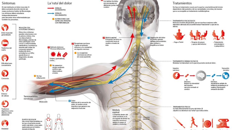 La fibromialgia es una enfermedad de causa desconocida cuyo síntoma principal es el dolor a la presión y palpación en localizaciones anatómicas definidas. El dolor suele ser difuso y persistente, quemante, punzante o penetrante. Involucra cuatro cuadrantes del cuerpo y el esqueleto axial. Las regiones más frecuentes son la lumbar, cervical, hombros, rodillas, muslos y brazos. El dolor suele empeorar con el frío, infecciones, estrés y falta de sueño. Otro de los síntomas que se muestran típicamente asociados al dolor, es el agotamiento o fatiga crónica, sin causa que lo justifique. Oscila durante el dia, de intensidad moderada a severa. También es frecuente encontrar los trastornos del sueño, problemas para conciliar el sueño o interrupciones frecuentes de este durante la noche siendo un sueño no reparador. Otros síntomas asociados: síndrome del colon irritable, síndrome de vejiga irritable, rigidez del cuerpo, generalmente matutina, cefaleas, malestar abdominal, parestesias, entumecimiento y mareos. Aunque la FM no es una enfermedad mental, el 30% aproximadamente de los enfermos cursan con cuadros como ansiedad o depresión de forma preexistente, o muchas veces secundaria a la enfermedad. También asociado trastornos cognoscitivos como dificultad para concentrarse o para retener información.
